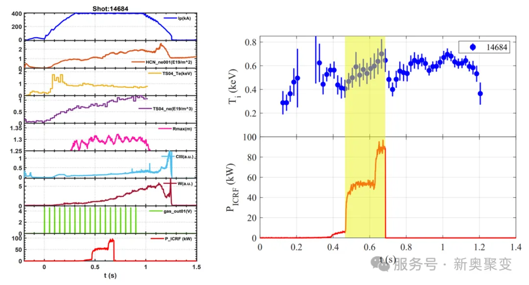 等离子体最外闭合磁面位置的精确控制为离子回旋共振加热提供了稳定的位形保障,通过调控位形可有效增加离子回旋波的耦合效率,观测到对离子温度的加热效果。
