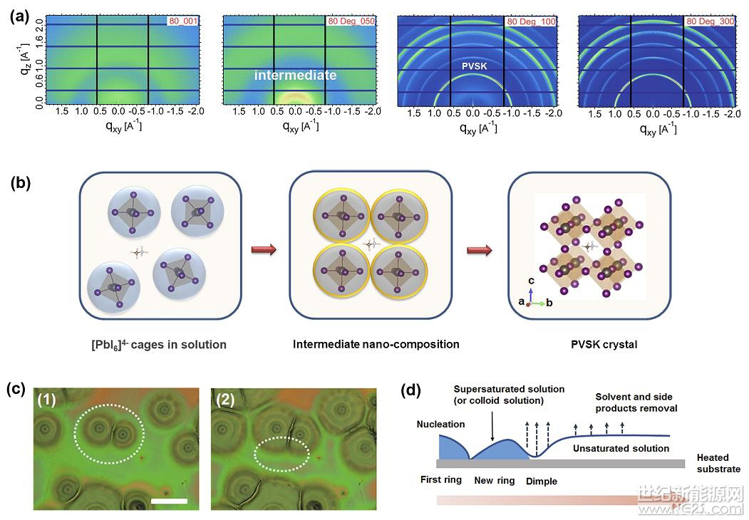 (a)印刷钙钛矿从前驱液到多晶薄膜转换过程中不同阶段的GIXD二维衍射图;